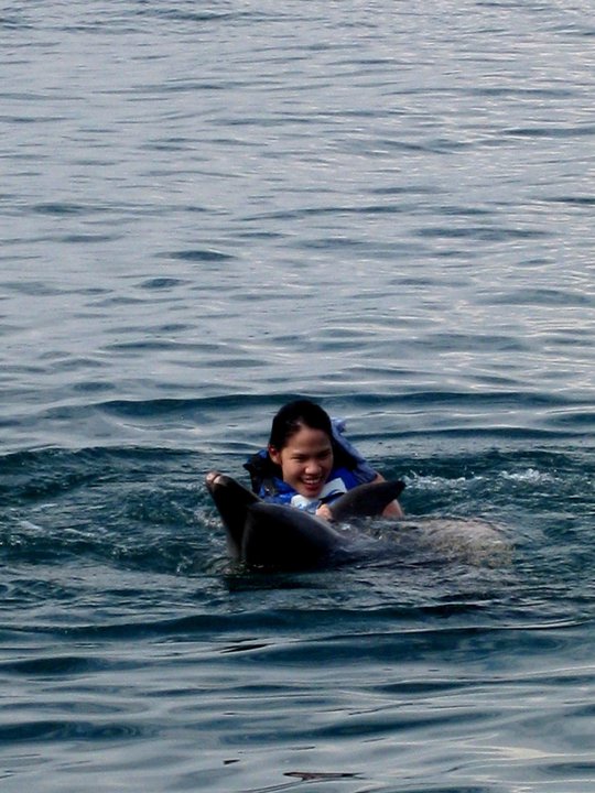 Dear Hubby and I were just all smiles all throughout. The trainer gives a 5 minute briefing about the different types of dolphins at the beginning of the session. There we find out that ours is named, Cito, a bottleneck dolphin rescued in the bay area. Excited as I was I tried very hard to listen to the instructor, but I was more worried about who will take our pictures. (Professional photographers at the park charge Php500 for the first 15 shots they will take) And finally our session was about to start. We walked towards the beach and saw two dolphins making their way into the shore. *dies of happiness* The instructor tells me to just grab onto to the fins and lay my body flat on his back. It was pure awesomeness, I tell you. Better than bungee jumping and cliff diving combined, IMO. (2 activities I had previously checked off my list, 2 equally exhilarating activity yet still manages to just come in second or third next to the dolphin encounter)